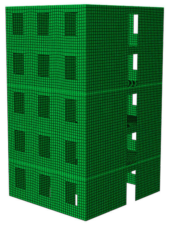 In the modeling process, this section adopts a macro-modeling strategy to simplify the blocks and mortar into homogeneous materials, whose mechanical properties are jointly determined by the blocks and mortar. The masonry walls and reinforced concrete slabs are simulated using continuous shell and layered shell elements, respectively, while the reinforced concrete ring beam uses layered shell elements. The mesh size in the numerical model is 300 mm, which is comparable to the actual size of the blocks. To ensure the integrity of the structural calculation model, the nodes with the same spatial coordinates are coupled together to coordinate their deformation. Finally, a structural finite element model containing 14,670 elements was established, as shown in Figure 5.