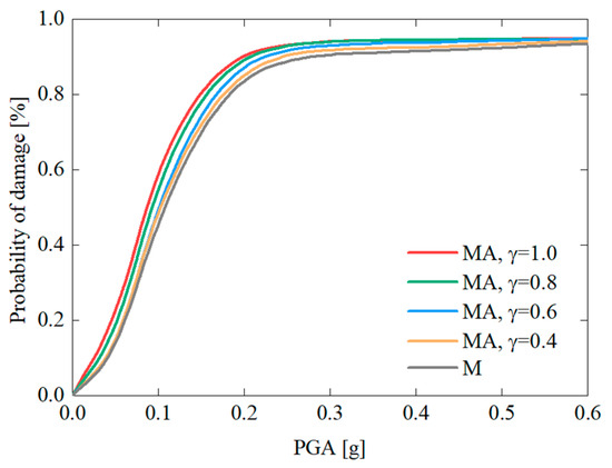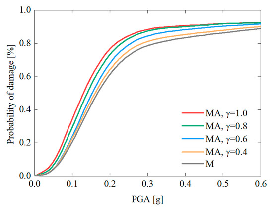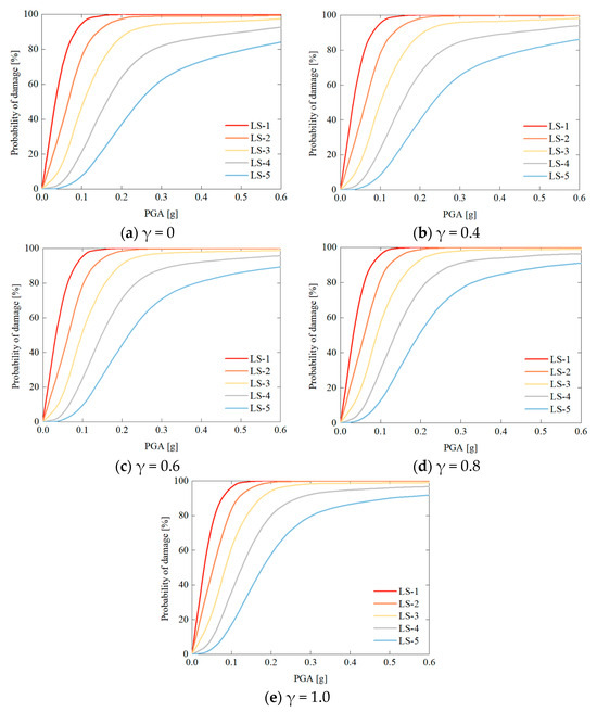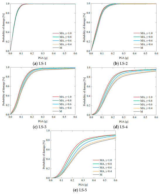 In this section, the fragility curves of different LS under five aftershock intensities are calculated, as shown in Figure 6. For each curve, the exceedance probability increases with the increase in PGA, indicating that as the earthquake intensity increases, the probability of the URM structure entering a more severe damage state increases, and the earthquake intensity has a significant impact on the degree of damage to the structure. For a given PGA, as shown in Figure 6a, when the structure is only affected by the main shock, when PGA = 0.10 g, the probabilities of the structure exceeding LS1-LS5 are 0.91, 0.78, 0.51, 0.22, and 0.04 respectively; Figure 6e, the relative intensity of the aftershocks reaches the mainshock level. When PGA = 0.10 g, the probabilities of the structure exceeding LS1-LS5 are 0.97, 0.84, 0.62, 0.35, and 0.16 respectively. It can be seen that as the relative intensity level of aftershocks increases, it means that the impact of lower intensity aftershocks on the safety of the URM structure is small or even negligible. However, when strong aftershocks occur, the structure’s anti-collapse ability significantly declines.