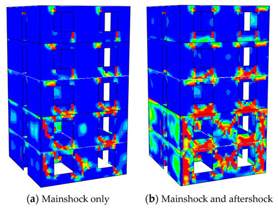 The masonry structure after experiencing only the mainshock and the mainshock–aftershock is shown in Figure 8. It can be seen from the comparison of the damage cloud diagram that the degree of damage to the structure increased significantly after strong aftershocks. Compared with the damage caused by the mainshock alone, aftershocks further aggravate the damage of the structure, manifesting in the expansion of cracks in a wider range and the enhancement of damage in local stress concentration areas. This phenomenon shows that strong aftershocks have a significant impact on the seismic performance of masonry structures, and strong aftershocks further weaken their overall stability.
