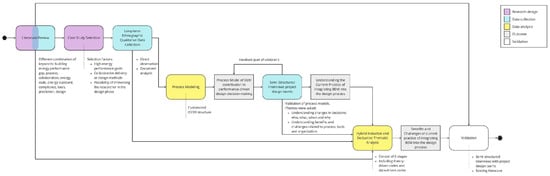 Firstly, the model was presented to the project teams during the interviews to verify data collected through direct observations and document analysis. Secondly, questions were asked based on two themes: (1) understanding the process of design decision-making, with a particular focus on decision changes by exploring the who, what, when, and why aspects; and (2) understanding the participants’ experiences in the case studies, specifically regarding the benefits and challenges encountered in terms of process, tools, and organizational aspects. Afterward, the interviews were transcribed and analyzed to bridge the information gaps, enhancing understanding of the design process and identifying additional themes related to benefits and challenges.