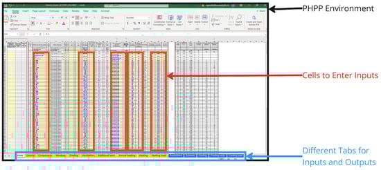 The first case study, the “Vienna House” project, is a six-story affordable social housing project located in Vancouver, Canada, with a treated floor area of 7591.3 m2. The project’s design phase began in September 2021 using a combination of the Construction Management (CM) and IDP delivery model. Figure 2 illustrates the collaborative project environment, with the design team actively addressing design issues. Aiming to achieve PH building certification, project stakeholders initially discussed various options for setting energy efficiency goals in IDP Workshops, including PH certification, PH-like, and Step 4 of the BC Energy Step Code. PH-like did not offer a significant enough improvement to justify additional costs, while Step 4 was not as rigorous as PH. PH offers greater energy savings and environmental benefits. Finally, the project aimed to obtain PH Classic certification, and one of the IDP design workshops specifically focused on PH design considerations to help project stakeholders understand the high-level engineering concepts and building system design for PH. The PH Planning Package (PHPP), an Excel-based quasi-steady-state energy analysis tool, was used for BEM. Figure 3 shows the PHPP interface for the Vienna House project, highlighting key areas for inputs, outputs, and the overall PHPP environment layout, with numerous cells requiring manual entry. Space heating and cooling demands, frequency of overheating, airtightness, primary energy renewable demand, and non-renewable primary energy are the key design metrics for PH certification. Throughout the project, these metrics were used to ensure that the design aligned with the project’s energy efficiency goals. The mechanical consultant company was responsible for managing the PHPP and energy modeling.