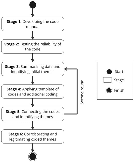 A hybrid approach of inductive and deductive thematic analysis was used in this study, with the aim of leveraging the benefits of both. This hybrid approach provides greater rigor for qualitative studies [62] and it allows for triangulation of findings [63]. It is a flexible and iterative approach that allows for a better understanding of phenomena. It analyzes the study within a predefined and acceptable framework, yet it remains open to the emergence of new themes. As this approach is a recent development by Fereday and Muir-Cochrane [62], and it has been predominantly used in social and nursing research, its application in the construction industry research remains relatively limited. While hybrid deductive and inductive research designs are prevalent among some construction industry researchers [64], there are few instances of coupling them with coding, particularly in content analysis (e.g., [65,66,67,68]) and rarely in thematic analysis (e.g., [69]). This study follows the six stages of the hybrid inductive and deductive thematic analysis approach developed by Fereday and Muir-Cochrane [62], which utilized the coding stages from studies [60,61]. Figure 7 shows the six stages undertaken to code data.