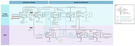 To highlight the key aspects of PTO lenses and sequence of activities, a customized structure of IDEF0 (shown in Figure 6b) was employed in this study to model the design process. In this customized IDEF0, each activity box features three small boxes: one on the right side to represent the design and analytical tools that were used, one at the top left corner to indicate the activity’s starting date, and one at the bottom left corner to indicate the activity’s ending date. In this study, activities are categorized into two groups: design decision-making and energy modeling, to provide a clearer understanding of BEM integration within the design process. Design decision-making activities are denoted by a ‘D’ prefix preceding their activity number, while energy modeling activities are identified with an ‘E’ prefix. The input arrow in the IDEF0 structure represents the documents, information, or decisions necessary for a specific activity, while the output arrow signifies the final decision or outcome generated from that activity, which can be in the form of a document, information, or decision. Mechanisms refer to physical aspects of the activity such as people, machines, and tools. While tools can be categorized as mechanisms, this study opted to refer to mechanisms as roles to emphasize the importance of interactions and collaboration in decision-making concerning building energy performance. The width of the role arrow corresponds to the number of roles participating in a particular activity. Controls can include standards, plans, templates, and checklists or any inputs that direct the activity. Differentiating between inputs and controls in the IDEF0 structure can occasionally introduce uncertainty. Inputs undergo transformation or modification to create the desired outputs, whereas controls rarely undergo changes. Controls in the customized IDEF0 refer to strong constraints associated with building energy performance for decision-making. Design process modeling using the customized IDEF0 facilitates the identification of areas that require enhanced collaboration and interactions among stakeholders, revealing isolated stakeholders and delineating the transitions between different design stages. Additionally, it aids in understanding whether decisions are made or used at the right time during the design phase. Furthermore, the model was presented to project teams through semi-structured interviews to verify data collected through direct observations and document analysis.