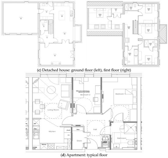 Figure 1 displays the 3D models of the four dwellings created in EDSL Tas. None of the dwellings’ layouts (Figure 2) were modified or adjusted for this study, and were modelled in adherence to the floor layouts and dimensions given by the architects who originally designed them. The only parameters changed were the building material’s U-values (that is, thermal transmittance), which were kept consistent among all building/dwelling types, as well as the building’s orientation (facing north). These were intentionally changed to ensure that the parameters between the building types were consistent so that realistic and valid results were obtained.