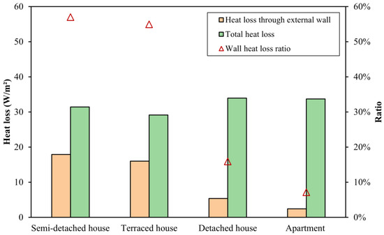 However, when comparing heat losses solely through the external wall in terms of the floor area, the results were almost inverted. As can be seen, the apartment and detached house had the lowest and second-lowest heat loss values of 2.4 W/m2 and 5.4 W/m2, respectively, which contributed to 7.15% and 16% of their total heat losses. In comparison, the semi-detached house was the worst performing, with a wall heat loss of 17.9 W/m2 accounting for about 57% of the total heat loss, followed by the terraced house with a heat loss of 16 W/m2 through the external wall, which contributed to approximately 55% of its total heat loss. This is because the apartment was land-locked with neighbouring rooms of similar temperature, and there were limited internal, ground floor, or roof-based heat losses in comparison with the other dwelling types.