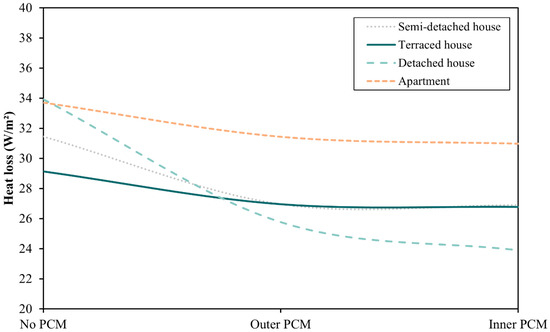 Figure 5 displays the effects of PCM integration methods among the different dwelling types, which revealed a consistent downward trend (from no PCM applied to interior PCM positioning) in heat losses. Basically, heat losses in all dwellings were reduced when PCMs were integrated, with the PCM situated internally being the most effective. It can be concluded that in the winter of North East England, the PCM is preferable on the internal side of the facade due to its proximity to the heat source, which aligns with the PCM transition temperatures between 15 °C and 90 °C [70]. In this study, most indoor conditions were set to a design temperature range of 19–21 °C with a setback of 16 °C, which created a 3–5 °C differential between melting and solidifying temperatures. On the other hand, almost all dwellings that placed PCM externally made little difference in comparison with internal positioning. In this case, solar gains might have somehow sped up the melting of the external PCM. Furthermore, the largest heat loss reduction improvement was seen for the detached house, from 34 W/m2, with no PCM applied, to approximately 26 W/m2 for the externally positioned PCM (outer PCM), which was improved further to 24 W/m2 when the PCM was internally positioned.
