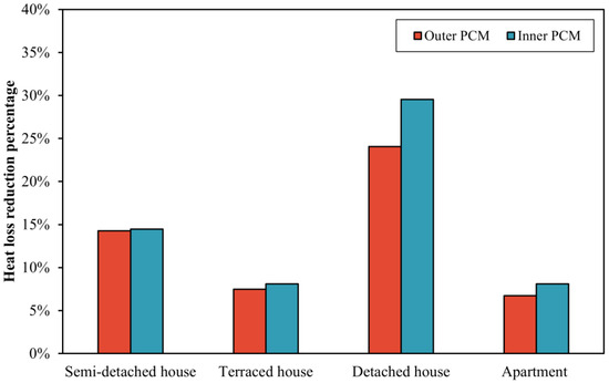 Figure 6 shows the heat loss reduction percentage both for internally and externally positioned PCM against the no PCM scenario for different dwellings. As can be seen, all the dwellings received reductions in heat loss when the PCM was applied, no matter internally or externally. This indicated that the PCM can achieve transitioning temperatures to undergo phase change. Fundamentally, the internal air temperature coincided with the PCM melting temperature during the time of heating demand, allowing it to store heat and release it as the building started to cool down, which offset the time the room took to reach the setback temperature and reduced the peak demand in the next heating cycle. Looking at the percentage reduction in Figure 6, the detached house displayed the highest heat loss reduction when adopting PCM on external walls, in which a respective reduction of 24% and 30% was achieved for the outer and inner PCMs. This, however, demonstrates that PCM integration is most suitable for this type of dwelling.