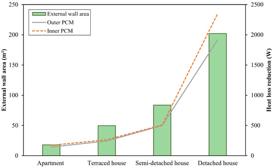 It has been discussed in the literature review how multiple parameters affect PCM performance and are often interlinked, but this study maintained consistent parameters throughout all the dwellings with the exception of the external walls area. Specifically, the relationship between external wall area and heat loss reduction was explored, showing a consistent positive correlation as per Figure 7. Basically, it displayed a linear relationship where the heat loss reduction increased with the increase in the external wall area, while the increased wall area of the internal wall PCM (that is, outer PCM) correlated with a greater heat loss reduction than that of the external wall PCM. In addition, as external wall area increased, the PCM heat loss reduction improved at a consistent rate when the PCM was located internally; similarly, when the PCM was integrated externally, heat loss reduction increased exponentially with the increase in the wall surface area, which was particularly evident in the scenario of the detached house. This was possibly due to the higher level of latent heat storage available and the overall increased thermal mass, particularly for the detached and semi-detached houses which had the largest external wall areas. In Figure 7, although the apartment and the terraced house showed a slight anomaly with lower heat loss reductions than expected, both were limited by their small wall areas. Despite the preference for internal PCM positioning, Figure 7 shows that all dwellings except the detached house had a nearly parallel performance between the PCM positions. As the two performance lines for heat loss reduction approached the detached house, the area between both lines increased, indicating that the effect of the outer PCM was beginning to weaken whereas the inner PCM continued to perform effectively.
