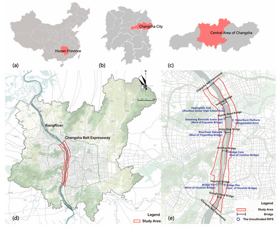(a) Location of Hunan Province on a map of China. (b) Location of Changsha city on a map of Hunan Province. (c) Central area of Changsha city. (d) Study area of internet-famous sites. (e) Locations of uncultivated riverfront internet-famous sites in Changsha.