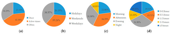 In terms of the length of stay (Figure 3d), the proportion of people staying “1–2 h” is much higher than that of other options, accounting for 31.9%. The percentages of other options are all between 10% and 20%, with little difference.