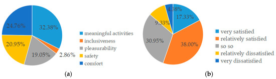 Meanwhile, the overall satisfaction results of the onsite visitors showed a positive attitude (Figure 4b): more than half of the interviewees were relatively satisfied (38.00%) or very satisfied (17.33%), 30.95% of the respondents felt neutral, and less than 10% of the visitors had a negative attitude (the proportions of relatively satisfied and very dissatisfied were 9.33% and 4.38%, respectively).