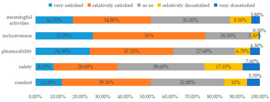 From the perspective of sub-indicators (Figure 5), inclusiveness and pleasurability are the two most satisfactory factors for visitors, while safety is the most worrying factor for visitors. (1) In terms of “being able to carry out meaningful activities”, the proportions of “relatively satisfied” and “so so” are very close, where both of which are about 35%. Notably, this is the public space feature that visitors are most considered about, which indicates that it still needs to be improved in the future. (2) ”Inclusiveness” is the one with the highest satisfaction degree and the lowest dissatisfaction degree among the five spatial characteristics, with more than three quarters positive comments and less than 4% negative comments. (3) The result of “pleasurability” is similar to that of “inclusiveness”, with the highest proportion of “relatively satisfied” and similar “very satisfied” and “so so” options. (4) In terms of “safety”, the answers of “very satisfied” and “relatively satisfied” account for the lowest proportion among the five dimensions, while the answers of “less satisfied” and “very dissatisfied” account for the highest, which proved that this option is surely an urgent factor to be improved. (5) In “comfort”, the proportions of “relatively satisfied” and “so so” are more than 30%, and the proportions of “very satisfied” and “less satisfied” are close, both about 10%.