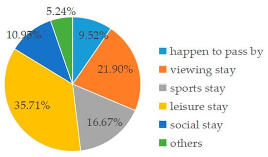 In terms of the different types of lingering activities (Figure 6), the highest proportion is leisure stay (35.7%), mainly including fishing (32), seeing the water (11), camping (6), walking with children (6) and lying down for rest (10). Viewing stops account for 21.9%, mainly including personal posing (19), viewing scenery (10), watching others (19) and taking photos (6). Sports stays account for 16.7%, mainly walking (13), swimming (11) and cycling (7). Social stays account for 11%, mainly chatting (8), drinking tea (6) and playing chess (4). In addition, 9.5% (20 people) happen to pass by without purpose, and other situations account for 5.2%, mainly due to the business behavior of vendors and sanitation workers here.