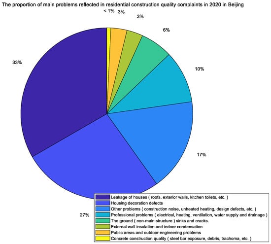 With the continuous development of the economy and continuous improvement of living standards, higher requirements have been proposed for the quality of residential construction. As an organization that carries out social supervision on goods and services and protects the legitimate rights and interests of consumers, the China Consumers Association (CCA) is an important institution to undertake consumer complaints. Housing is also a commodity, and the occupants of housing are also consumers. Complaints about the quality of housing will also be received by the CCA as consumer complaints. Therefore, CCA’s consumer complaints can well reflect the quality of residential constructions. According to data on the acceptance of complaints published by the CCA, the proportion of quality complaints in housing and building material complaints in 2018, 2019, and 2020 was 35.51%, 31.05%, and 25.28%, respectively, indicating a high proportion of complaints [1]. In 2018–2020, the proportion of leakage-related complaints decreased slightly, due to the rise in the total number of complaints caused by the awakening of residents’ awareness of rights protection. High proportion of leakage-related complaints in residential constructions is caused by the universality of leakage problems, so the proportion of leakage-related complaints is always high. In addition, among all types of quality problems in residential construction, the leakage problem is universal and repetitive and is a difficult problem that affects the project quality [2]. According to the Beijing Municipal Commission of Housing and Urban-Rural Development’s quality complaint data for residential construction in 2020, the proportion of complaints regarding leakage from residential construction (roofs, external walls, kitchen toilets, and other parts) was 33.3%, and all types of residential construction were involved [3]. To propose a more scientific and effective solution to the leakage problem in residential construction, we must first determine the internal law of the loss of leakage problems in residential construction. However, no research has been conducted on the loss law of leakage in residential construction, necessitating a quantitative analysis. The proportions of the main problems identified in Beijing’s residential construction quality complaints in 2020 are shown in Figure 1.
