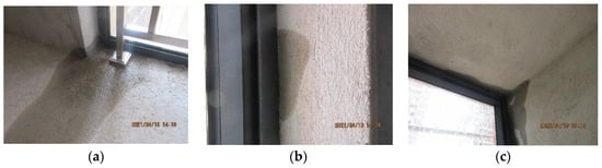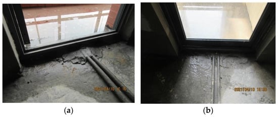The leakage of the water spray tests is mainly manifested as the leakage at the contact between the window and ground, leakage at the contact between the window and inner wall, and leakage at the contact between the window and roof (as shown in Figure 3). Leakage in the water storage tests mainly manifested as small balcony anti-seepage and kitchen threshold seepage (as shown in Figure 4).
