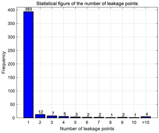 It can be observed from Figure 6 that the distribution of the number of leakage points in residential constructions with two or more leakage points decreases, with the characteristics of gradually leveling off from high to low. This feature is consistent with a real-life situation, indicating that the test data conform to the law of random distribution and are effective.