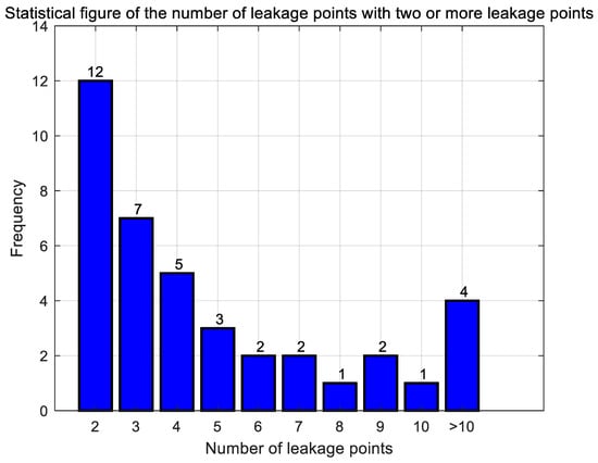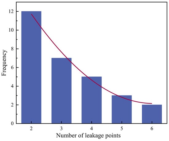 It can be observed from Figure 5 that, in the leakage test, more than 90% of the cases were microleakages formed by a single leakage point, and the leakage area of most leakage problems was far less than 0.1 m2. Because there are numerous leakage problems with a single leakage point, the statistical law for more than two leakage points is not well reflected in Figure 5. Therefore, it is necessary to draw a statistical figure for the number of leakage points in a residential construction with two or more leakage points, as shown in Figure 6.