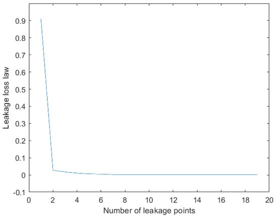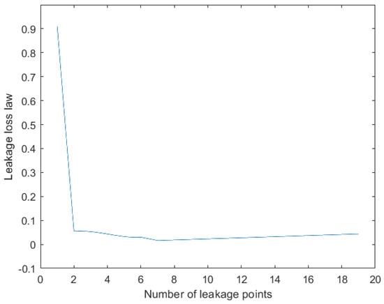 As shown in Figure 10, the loss of residential construction leakage was primarily concentrated in the case of a single leakage point. In the case of multiple leakage points, the loss first decreased and then increased, and the minimum loss occurred when the number of leakage points was seven. This situation belonged to the case where the number of leakage points was the least in the first-level leakage grade. In this case, the probability of occurrence was low and the number of leakage points was relatively small.
