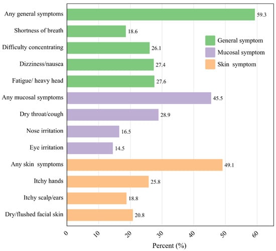 The prevalence of SBS symptoms among Suzhou residents during the COVID-19 pandemic is shown in Figure 2. Of the participants, 59.3%, 45.5% and 49.1% reported general, mucosal and skin SBS symptoms, respectively. Dry throat/cough was the most common symptom (28.9%), followed by fatigue/heavy head (27.6%) and dizziness/nausea (27.4%).
