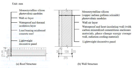 Figure 2 illustrates the design and composition of the roof and wall structures in zero-carbon buildings. The key materials integrated into the building envelope include carbon mineralized cementitious materials, which absorb CO₂ during their production, reducing the carbon footprint of the building. It also highlights the use of phase change energy storage walls that regulate indoor temperatures by absorbing and releasing heat, thereby reducing energy demands. The radiation cooling materials applied to the roof and walls contribute to passive cooling by emitting thermal radiation, minimizing the need for active cooling systems. Additionally, multifunctional photovoltaic power generation materials are embedded into the structure to produce renewable energy while providing insulation and shading. Together, these materials create a highly efficient envelope system that enhances the building’s energy performance and contributes to zero-carbon operation.