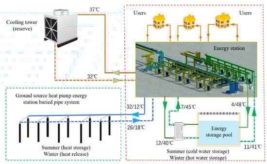 Figure 4 presents the operational process of an energy station that uses a ground source heat pump in conjunction with energy storage. The system transfers heat between the ground and the building, utilizing renewable geothermal energy to provide heating and cooling. Additionally, heat exchange technology enhances energy efficiency by recycling thermal energy within the building. The integration of multi-energy complementary technologies allows for the combined use of various energy sources, ensuring a consistent energy supply. The energy station stores surplus energy during periods of high renewable generation and utilizes it during low-generation periods, improving the overall system resilience and reducing carbon emissions.