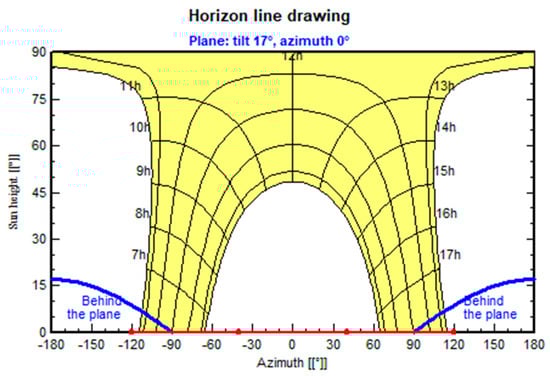 Figure 6 illustrates the sun’s path across the sky relative to a tilted plane with a 17° inclination facing true north (azimuth 0°). The vertical axis represents the sun’s height above the horizon, while the horizontal axis shows its azimuth, or compass direction. The yellow area indicates the sun’s trajectory throughout the day, with specific time labels marking the sun’s position at different hours. The red line shows when the sun is visible in front of the plane, while the blue line represents times when the sun is below the plane’s horizon.
