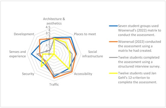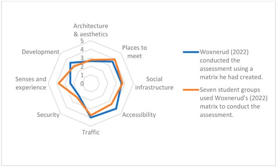 Figure 2 shows the assessment of Woxnerud [] using the first assessment method alongside the mean values from the seven student groups. This comparison highlights differences in five of the eight categories: Architecture and Aesthetics (0.14), Places to Meet (0.37), Social Infrastructure (0.11), Security (0.29), and Senses and Experience (1.37). In these categories, the average value from the student groups is higher than the authors’ assessment. Conversely, for Accessibility (0.77), Traffic (0.26), and Development (0.60), the authors’ assessment values are higher. When recording the former differences as positive values and the latter as negative ones, the average difference is 0.65/8 = 0.08.