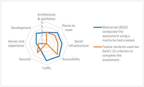 Figure 3 displays the assessment of Woxnerud [] using the first assessment method alongside the mean values from the twelve students who used the second assessment method. This comparison illustrates significant differences in two of the six categories: Architecture and Aesthetics (0.02) and Security (1). In these categories, the average value from the twelve students using Jan Gehl’s 12-criterion assessment matrix is higher than the authors’ assessment values. Conversely, for Places to Meet (0.87), Social Infrastructure (0.94), Accessibility (0.62), and Senses and Experiences (0.52), the authors’ assessment values are higher. Recording the former differences as positive values and the latter as negative values results in an average difference of 1.93/6 = 0.32.