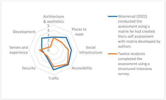 Figure 4 displays the assessment of Woxnerud [] using the first assessment method alongside the mean values from the twelve students who used the third assessment method. This comparison illustrates differences in one of the eight categories: Senses and Experiences (0.43). In this category, the average value from the twelve students who completed the assessment using a structured interview survey is higher than the authors’ assessment value. Conversely, for Architecture and Aesthetics (0.10), Places to Meet (1.35), Social Infrastructure (0.60), Accessibility (0.20), Traffic (0.59), Security (0.25), and Development (2.49), the authors’ assessment values are higher. Recording the former differences as positive values and the latter as negative values results in an average difference of 3.60/8 = 0.45.