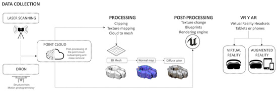 Numerous studies in the literature focus on the development of new XR environments for remotely visiting heritage sites, visualizing their original appearance, or supporting technical tasks such as site diagnostics and preventive conservation [8,9,10]. In this case, the primary concerns are the inputs for the environment, as well as real-time visualization (including compatibility with devices with low computational power).