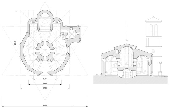 The Church of La Veracruz in Segovia stands out with its unique dodecagonal floor plan and distinct Romanesque style, making it an exceptional example of late Romanesque architecture in Spain (Figure 3). Dating back to 1208, this church is a notable late specimen closely linked to the Castilian School of architecture [32]. The design of La Veracruz is particularly significant due to its association with the Knights Templar and its resemblance to the Holy Sepulchre in Jerusalem. However, historical records indicate that it was actually constructed by the Knights of the Order of the Holy Sepulchre.