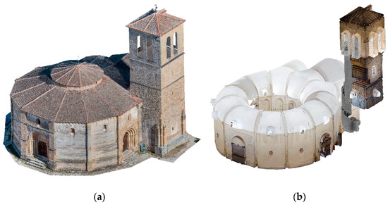 The 3D digitization of the Church was carried out in previous studies by combining laser scanning with a photogrammetric approach. Specifically, a Faro Focus 150 Plus scanner (Faro, Germany) was used to capture both the interior and exterior walls, while a UAV equipped with an RGB camera (DJI Mavic 2, DJI, Shenzhen, China) was employed to capture aerial photographs. The images were then processed using a standard Structure from Motion (SfM) method. To ensure both the laser and photogrammetric models were aligned within the same coordinate system, several control points extracted from the laser scans were applied to the photogrammetric model. A total of 43 scan stations and approximately 600 drone-captured photographs were required to document the entire structure. This process resulted in a 3D point cloud with an average resolution of 2 mm, allowing for a detailed digital representation of the Church (Figure 5).