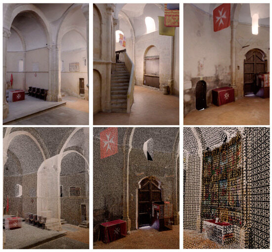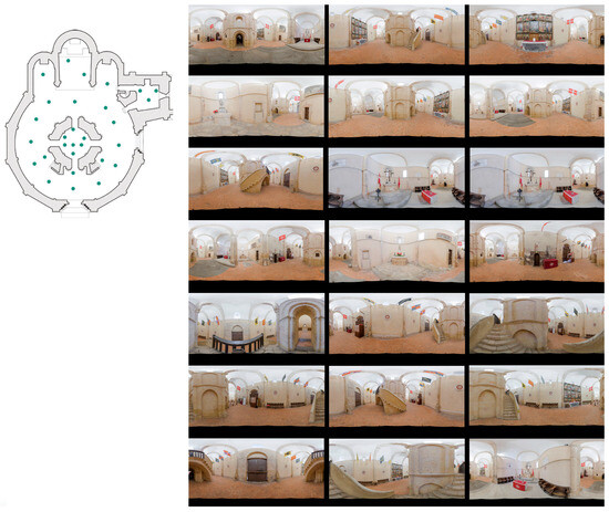 Each scan station is associated with a RGB and an infrared 360° image. The RGB panoramas were captured in high resolution, producing images of 16,952 × 8476 pixels with 300 pixels per inch (ppi) (Figure 6). A total of 43 photographs are taken: 21 of the central nave, 6 of the upper edicule vault, 4 of the Lignum Crucis chapel, 2 of the sacristy, 6 of the tower, and 4 of the lower Edicule vault.