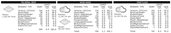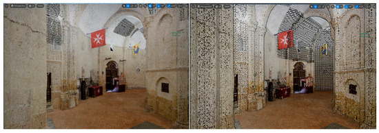 An evaluation of the technical resources utilized by each model introduced into the Virtual Reality environment is conducted. This evaluation is performed by creating three distinct models: the polygonal mesh, the 3D point cloud, and a hybrid model that combines elements of both. In this evaluation, specific attention is given to the representation of key architectural elements, such as two walls and the church floor, which are modeled as a mesh, while the remaining structural elements are depicted using the point cloud (Figure 17). The hybrid model is found to be particularly effective in maintaining both visual quality and the fluidity of the virtual experience, making it the preferred option for applications that require a balance between detail and performance.
