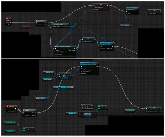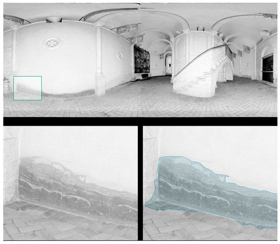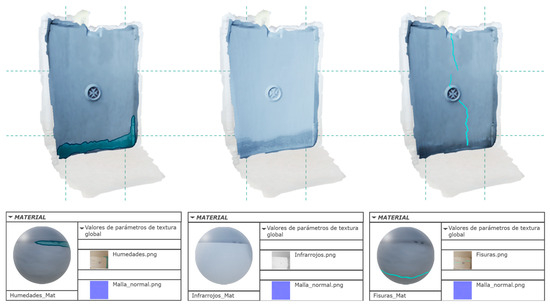 To enhance the immersive quality of the virtual reality experience (when the users chose the mesh), Unreal Engine’s visual scripting language, known as Blueprints, is employed (Figure 11). This advanced feature allows users to interact with the virtual environment in real time, offering the capability to dynamically switch between different material types. Moreover, users can preview various forms of structural damage, such as cracks, moisture-related issues, or material degradation. The integration of Blueprints results in the creation of an interactive scene where users can explore and analyze different types of damage that have been selected for study (Figure 12). The mapping of damage was manually performed in Photoshop (Figure 13). This level of interactivity is further enhanced using infrared panoramas combined with thermal imaging, which enables the precise identification and delineation of moisture-affected areas within the structure (Figure 14).