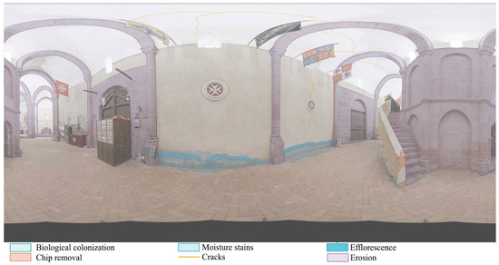 Screenshots of the scene using 360-degree images with a selection interface. Visualization of lesions: biological colonization, detachment, efflorescence, erosion, cracks, moisture stains.