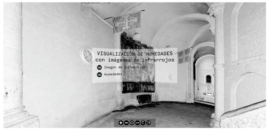 For the static environment, the primary inputs are panoramic images captured by the laser, which result from the reflection of the laser beam, as well as RGB panoramic images generated by the integrated camera. Both types of images share the same point of view, providing identical information. These images are then post-processed using Photoshop to map the damage present in the building. Generally, most damage can be mapped using only the RGB images. However, in certain cases, the panoramic images obtained from laser reflections can enhance damage detection, particularly in areas with moisture. This is due to water’s specific behavior in absorbing energy, which makes moisture more detectable in the laser-captured images. All this information, including the panoramic images and mapped damage, is integrated into the Pano2VR v7.0 software as individual panoramas, which are interconnected to allow seamless navigation throughout the Church. This approach enables the creation of a static virtual environment that is compatible with low-resource devices, as it eliminates the need for 3D rendering of the building. Additionally, this environment can be enhanced with supplementary data, such as thermal images, to provide a richer and more detailed experience. Unlike dynamic VR experiences that may involve real-time interactions or animations, this static immersive scene focuses on providing a high-fidelity, detailed view of the building as it appears in the edited 360-degree images.