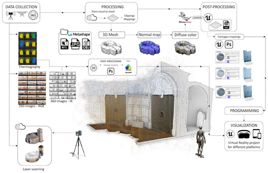 Typically, the geometrical base used for virtual environments relies on reality capture techniques, often utilizing remote sensing sensors. These sensors can be categorized as either passive (e.g., digital cameras) or active (e.g., laser scanners), and they capture not only geometric data but also radiometric information. These data can then be used to generate highly detailed and accurate 3D models in the form of point clouds or meshes that precisely represent the captured scene [11]. Moreover, the captured information can support damage mapping by using the geometry contained into the 3D models, as well as its radiometry [12,13]. The radiometric data can be gathered in the visible spectrum or beyond, such as in the infrared range by using the reflectance values of the laser scanner, multispectral [14,15], and thermal cameras. This information is often compared with other previous tests to assess construction systems or trace the origin and progression of damage [16,17,18].