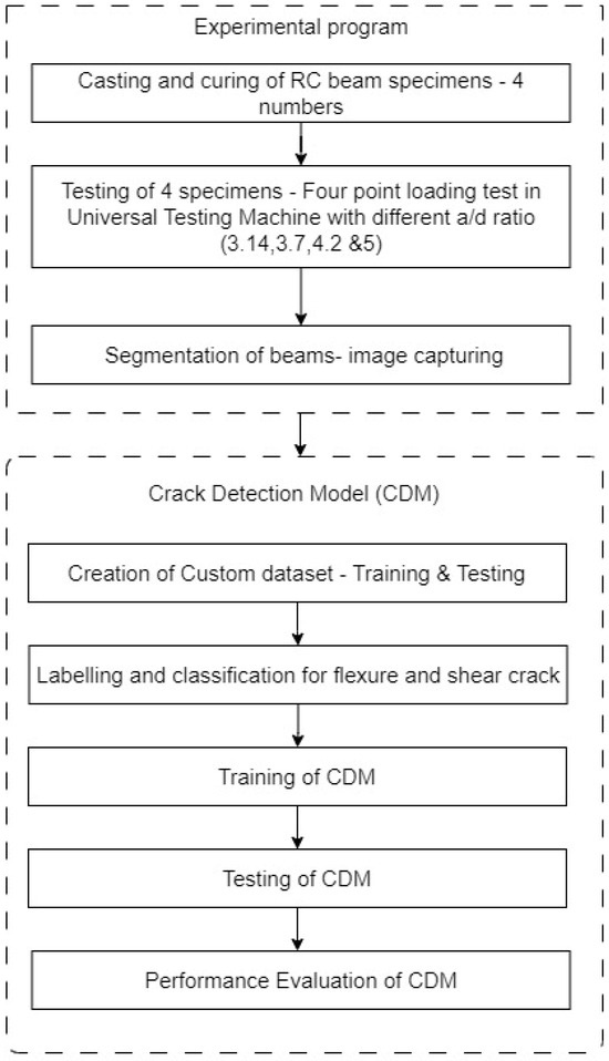 The occurrence of cracks like flexure and shear in concrete beam elements is a defect that cannot be avoided but can be predicted at its onset so that catastrophic failures in important structures can be avoided. Studying the types of cracks and their locations is important in structural elements, considering their life safety. In general, flexural cracks develop in the middle span of the beam because of bending and are ductile. The flexure crack appears vertical (90°) and forms across the longitudinal section. On the other hand, shear cracks usually form near the supports at an angle of 45°, where shear stress is maximum. These cracks are brittle and are to be addressed with immediate effect. Hence, a detailed full-scale experimental study on RC beams is conducted to validate and demonstrate the feasibility of the image processing technique using the YOLOv4-tiny deep learning method. The digital images captured during the testing are used to create the dataset required for the training and testing of the proposed CDM. Out of the total images captured, 90% of the images are grouped for training the developed CDM, and the remaining ones are used for testing the accuracy of the model and validation. The methodology used for crack detection using the YOLOv4-tiny model is shown in Figure 3.