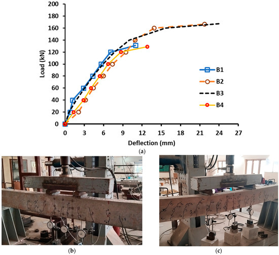 Table 1 depicts the test results for RC beams tested at varying shear span to effective depth ratios. Moreover, Figure 6 depicts the complete relationship between displacement and load of RC beams tested at different a/d ratios. For the beam B1 tested at an a/d ratio of 5.0, the first crack appeared at a load of 40 kN corresponding to a vertical displacement of 1.18 mm. The corresponding value of initial stiffness was calculated as 33.89 kN/mm. On further increase in load, the beam showed multiple formations of the flexure cracks and reached a peak corresponding to a load and vertical displacement of 131.21 kN and 10.92 mm. After this, the load started to reduce to the minimum value, and further data were not captured due to the load-controlled mode of testing. In the case of beam B2, the first crack appeared at a load and stiffness value of 20 kN and 9.45 kN/mm, respectively. Once the load reached closer to the peak value, some flexure cracks close to the support were converted to flexure-shear cracks, which started propagating towards the loading point and the support edge. The beam showed the peak load and corresponding displacement values of 166.7 kN and 21.8 mm, respectively. When compared to the beam at a high shear span ratio, beam B2 showed an increase in load by 21.2%, which can be attributed to the reduced bending effect under low a/d ratio. Similarly, the beams tested at an a/d ratio of 3.7 showed an increase in peak load by 27.7% when compared to beam B1 (i.e., a/d = 5.0). However, the beams tested at a low a/d ratio of 3.14 failed at a lower load of 128.96 kN due to the rapid initiation and propagation of the shear crack. This could also be due to the shorter distance between the support and load point at a/d of 3.14, as a result of which the inclined crack propagation was rapid, leading to a lower peak load.