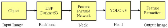 The use of the YOLO algorithm for localization and classification of the objects simultaneously in the image has been successful in the past [36,37,38,39,40,41,42]. The entire image is divided into regions in the YOLO algorithm to make it suitable for training and testing. Being a single-stage object detector, the YOLO algorithm divides the entire image into regions, predicts the ROIs and computes class probabilities for each ROI in one step. Moreover, it identifies several ROIs and calculates the weighted class probability for each box. The first version of the YOLO architecture was introduced in the year 2016 [41], and then successively updated with two more versions, YOLOv2 and YOLOv3, in the years 2017 and 2018, respectively [42]. The next version, YOLOv4, was launched in the year 2020. YOLOv4-tiny is a lightweight and scaled-down version of the YOLOv4 architecture. Compared to the parent version, YOLOv4, which has more than a hundred layers, the tiny version has only 29 layers starting from zero. Also, the tiny architecture consists of only two YOLO heads for predicting the ROI instead of three as found in the parent version. This size reduction helps in bringing down the computational complexity and speeds up the training or testing processes. As a result of these reductions, YOLOv4-tiny significantly reduces the computational time but without much compromise in accuracy for several real-time applications [42]. The YOLOv4-tiny algorithm shown in Figure 7 consists of steps such as backbone, neck and head for extracting the required outputs. The backbone of the YOLOv4-tiny algorithm is a DSP Darknet53, which performs the function of the extraction from the original images using a pre-trained CNN [42].