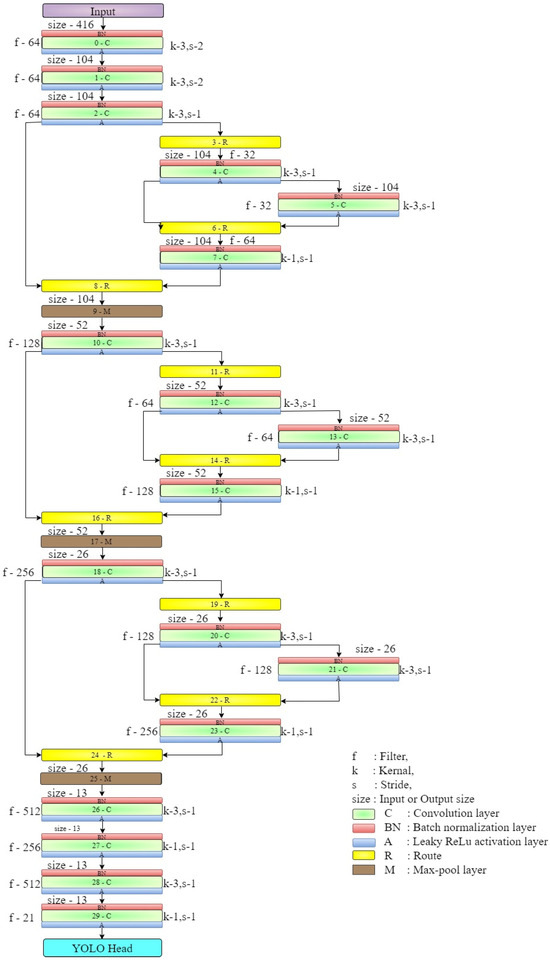 As shown in Figure 8, the backbone stage in the YOLOv4-tiny algorithm consists of numerous components that are directly and indirectly connected: an input layer, 18 convolution layers, nine routes, and three max-pooling layers. The input layer feeds the image of size 416 × 416 for training. The feature extraction of the convolution layers starts with that input image. The successive convolution layers extract a substantial number of learnable features from the input image. The convolution layers have a set of receptive filters that switch between 3 × 3 and 1 × 1 kernel sizes. Each convolution layer is connected with a batch normalization layer and a leaky rectified linear (Leaky-ReLU) activation layer to enhance computational efficiency. Routes are another part of the backbone stage that helps in recovering fine-grained characteristics of the image from the earlier convolution layers. In this way, it is possible to retain high-resolution quality even after multiple down samplings of an image. The backbone has two max pooling layers for down sampling the feature maps. The max-pool layer follows a convolution layer and uses the 2 × 2 kernel size and a stride of 2. This in turn allows the reduction of feature map size by 50%; it reduces the size of the feature map in half and cuts down the computational cost significantly.