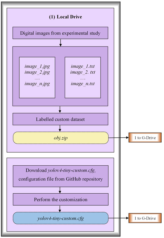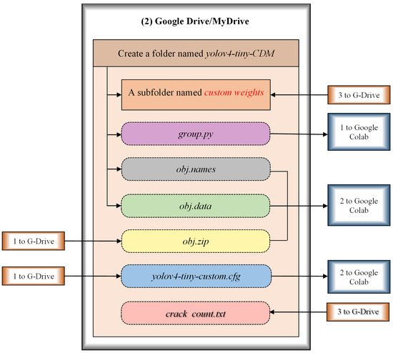 As shown in Figure 11, a folder named yolov4-tiny-CDM is created in the MyDrive of G-Drive with a subfolder named “custom-weights” and three files named “group.py”, “obj.names” and “obj.data”. The subfolder “custom-weights” is created to back up the weights that are generated during the training process of the CDM, Figure 10 and Figure 11. A Python script, “group.py”, is used for generating two files, namely “train.txt” and “test.txt”, that are required for the training and testing processes, respectively. The file “obj.names” has the list of class names of the cracks, i.e., flexure and shear. The file “obj.data” holds the class details and path details of folders and files that are necessary for the training and testing, as listed in Table 2. The compressed folder “obj.zip” and customized yolov4-tiny-custom.cfg configuration file, which are generated in the local drive, are also placed in the yolov4-tiny-CDM folder, Figure 10 and Figure 11. After preparing and retrieving all the necessary folders and files in the G Drive, it is mounted on the Google-Colab virtual machine (VM) for training and testing, Figure 10 and Figure 11. The yolov4-tiny-CDM folder will receive the “crack_count.txt” file that shows the total number of cracks as well as the number of flexure and shear cracks in an image after testing the image in Figure 10 and Figure 11.