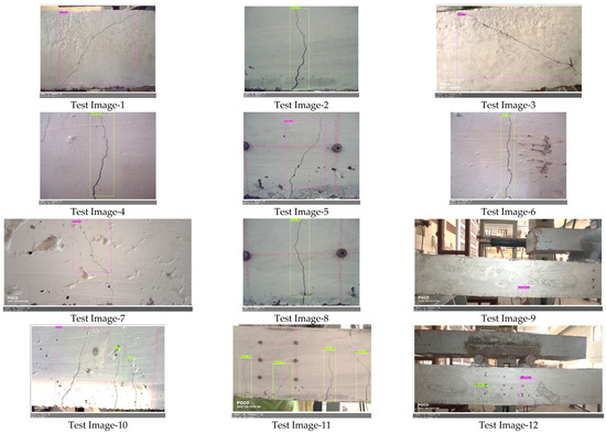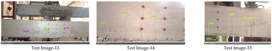 To make the images suitable for training and testing, the entire length of the beam (L = 2200 mm) is divided into several segments such as constant moment zone (CMZ), shear span (a), etc. Hence, each beam contains separate segments which may contain few or many or no cracks. Similarly, the number of cracks also depends on the load value (i.e., first crack load or peak load) during which it was captured. In the constant moment zone, the beam had the formation of one flexure crack at the load when crack initiation just occurred. Similarly, at a higher load level, as shown in Test images 10–11 of Figure 14, the beam had formation of three flexure cracks in the constant moment zone.