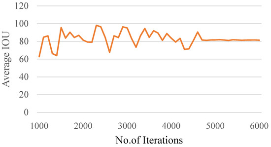 IOU is determined by the overlap between the ground truth and the predicted BBs, Equation (2). The threshold for IOU is taken as 0.5. The average IOU for the training images is found to be 82.93% for the set threshold, Figure 16.
