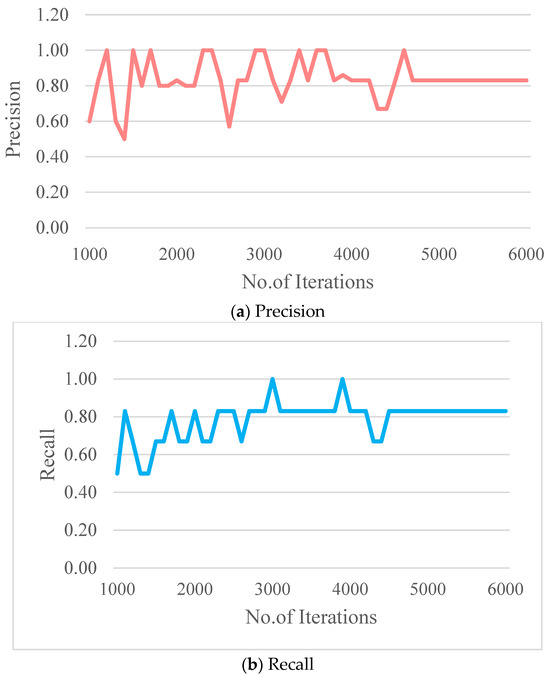Initially, the values of P and R are found to be fluctuating, and thereby, the F1 score is also fluctuating. However, once the CDM is trained, all these values have been stabilized, as shown in Figure 17. It takes 4700 iterations to attain this stabilized state during the training. For the trained CDM, the values of P, R and F1 score are found to be 0.83. The graphs of average IOU in Figure 16 and Precision (P), Recall (R), F1 score, and mean Average Precision (mAP) in Figure 18 offer a comprehensive view of the model’s performance in detecting cracks. The average IOU assesses how well the predicted bounding boxes overlap with the actual crack areas, indicating localization accuracy. Precision measures how many of the detected cracks are correctly identified, while Recall reflects the proportion of actual cracks the model successfully detects. The F1 score provides a balanced measure of both precision and recall. The AP value is the area under the P–R curve. Like P, R and F1 score, the mAP is also fluctuating initially and becomes stabilized after 4900 iterations during the training, Figure 1.