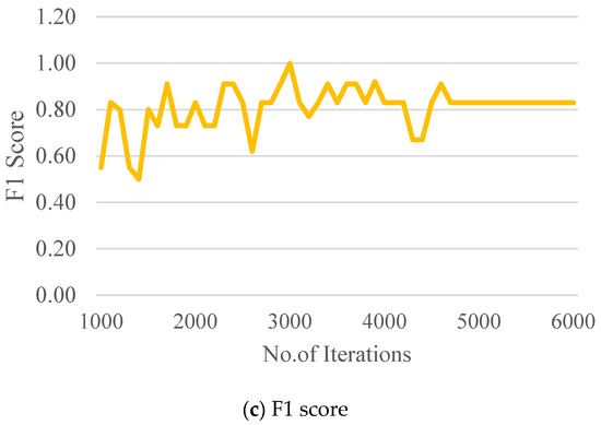 The F1 score is a measure of a model’s accuracy on a dataset, and it is a function of P and R given in Equation (3). P is the percentage of true positives predicted in Equation (4), and R is the capacity to detect all the true positives, as in Equation (5). TP, FP and FN refer to true positive, false positive and false negative, respectively.