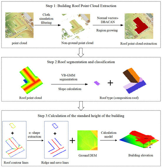 To address the challenges of building height extraction in large areas, such as low roof extraction accuracy due to occlusions and building type uncertainties, this paper combines building design specifications to accurately obtain the heights of various building types from point cloud data over a wide area. Data preprocessing was conducted prior to the experiments. CloudCompare v2.10 software was used for fabric simulation filtering, removing the ground point cloud while retaining the non-ground point cloud. The processed data were then applied in the subsequent experiments. The main steps of the algorithm proposed in this paper are shown below.