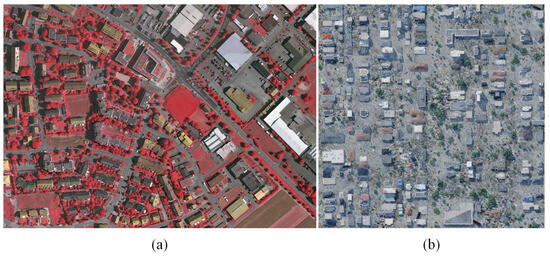 Figure 2b, is based on both simulated and real geographic environments, including actual urban areas and simulated topography and built environments. This offers a diverse and accurately labeled 3D point cloud dataset. The main objects in this area include buildings, trees, and terrain, with roofs of varying styles, primarily sloped, and complex structural forms. These features facilitate data processing in more intricate scenarios.