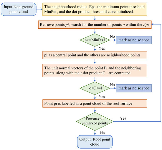 38] to extract the roof point cloud and eliminate the tree point cloud after preprocessing. The main steps of the normal vector density clustering process are illustrated in